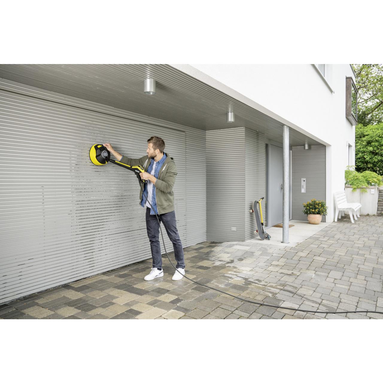 Der Twin Jet-Rotationsarm des Flächenreinigers T 5 T-Racer ermöglicht einen großflächigen Schmutzabtrag – und damit die schnelle und effiziente Reinigung großer Flächen im Außenbereich. Besonders praktisch: Der Flächenreiniger bietet die Möglichkeit, den Abstand der Düsen zur Reinigungsfläche individuell anzupassen. So können harte Oberflächen, wie Stein und Beton, ebenso bedarfsgerecht gereinigt werden wie empfindliche Oberflächen, wie zum Beispiel Holz. Verglichen mit der Reinigung per Strahlrohr lässt sich mit dem T 5 T-Racer etwa die Hälfte der Zeit einsparen. Außerdem schützt die Haube Anwender und Umfeld zuverlässig vor Spritzwasser, und der sogenannte Hovercraft-Effekt macht das Manövrieren zum Kinderspiel. Mit Hilfe des ergonomischen Handgriffs lassen sich auch vertikale Flächen wie Garagentore optimal säubern. Geeignet für Hochdruckreiniger der Klassen K 2 bis K 7.